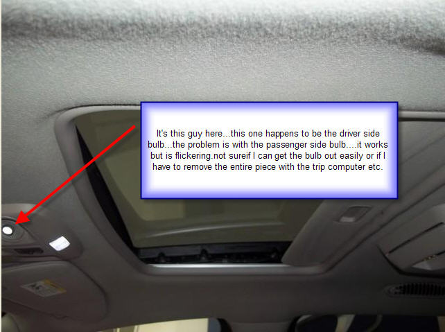Sorry, It's the front passenger reading light..(The directional ones that can be pointed in different directions) The lamp is working but it flickers...and is annoying as hell) Here's a link to a photo I took pointing to the lamp I am speaking of.