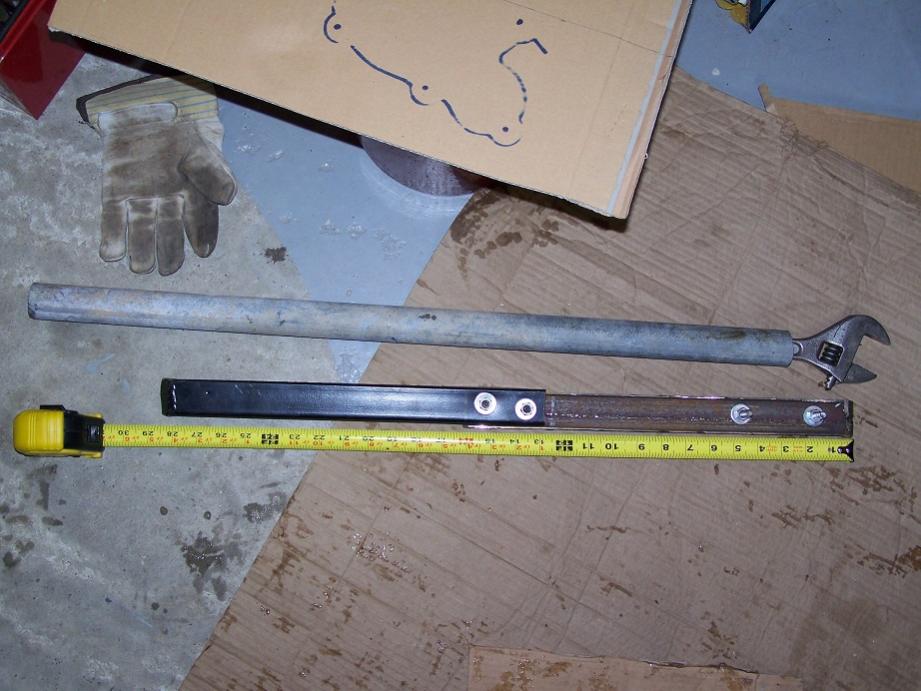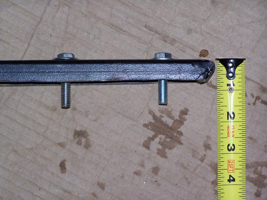 made from a chunk of 1" square tubing cut in half, you can use anything solid and strong. I found that 28" long was the right length for the wrench for bracing on the frame. I used 1 3/4" number 8 bolts, 3 1/16" apart. Anything longer in there might not work as it’s tight with the 1 3/4" bolts. Use washers and nuts to tighten on the handle. Use the belt tensioner to help align the bolt holes for both the loosening and tightening using the pin spanner.
