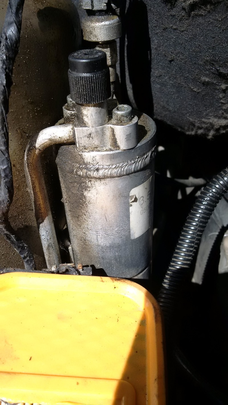 On my wife's 2006 Limited, on AC took a s h i t on us. This happened the time the gear case broke. A bad motor mount caused the motor to rock and put alot of pressure on the transfer case. When we were driving the transfer case broke. We pulled over the car on the side of the road, and then heard a hissing noise near the passenger side floor area. From that day forward it has not been able to hold a charge. I want to find out what went wrong and remedy this before it starts getting really hot. I went to parts source and bought some sealer, then a can of frigerant. I put that in, and it worked again. But only for 2 days, then it was gone.I tried looking around under the hood. I bought a can of dye. So I pulled off the air box. Hooked my guage to the port, turned on the car with the AC on full blast. Put the dye on the system and let it run for 15 min as it said. Felt it get cold again. Then tried to take the guage off of the car and damn near burned the crap out of my arm when it touched the AC canister? Should that thing get that hot? You couldn't leave your hand on it. As soon as you touch it, it was scolding hot? Attached is a pic of the canister that burned me. What are your thoughts? I need to get this thing fixed asap. Needles to say it stayed cool for 5 min, then nothing again.