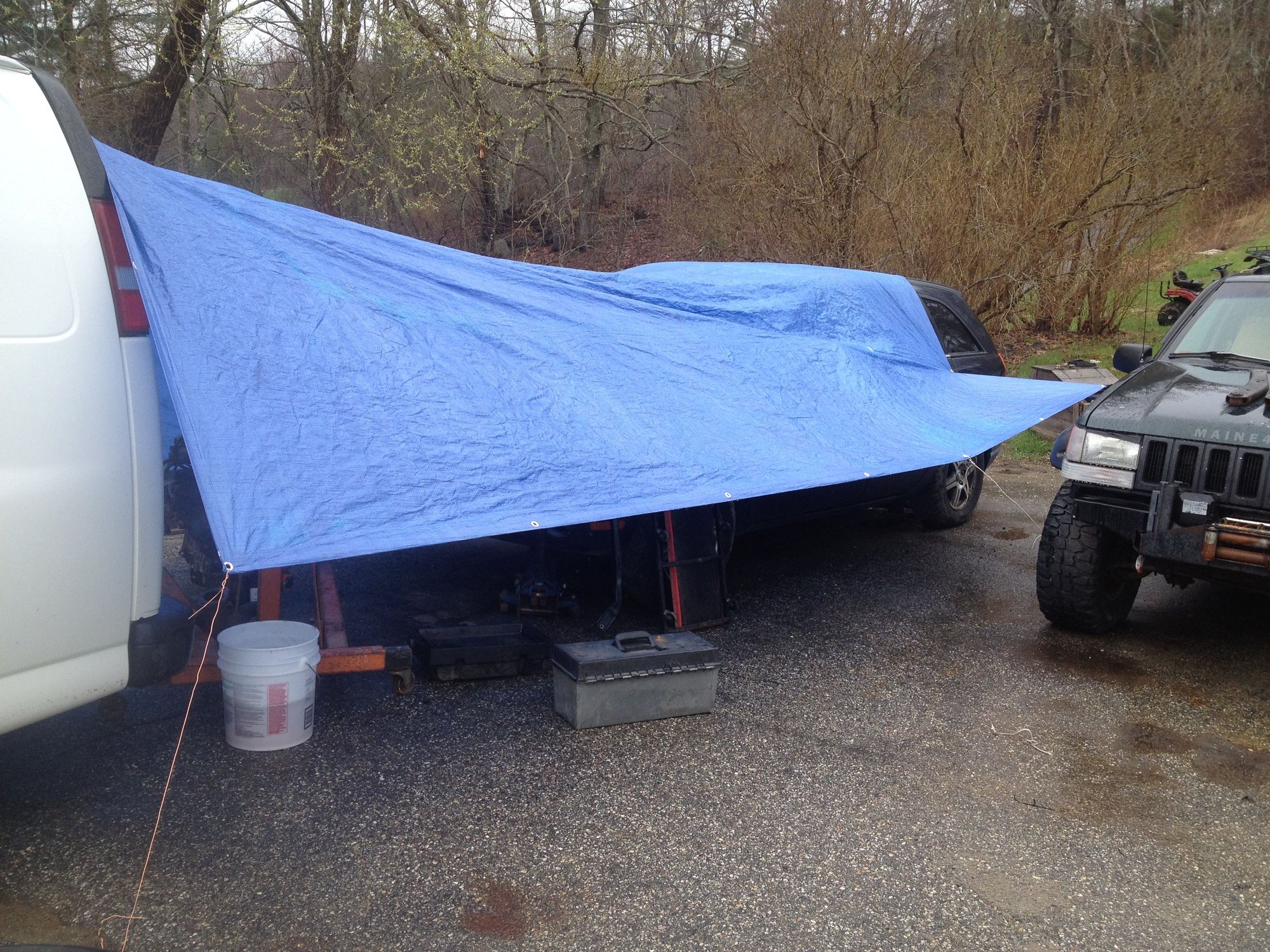 Good stuff! Love the redneck shop cover, not everyone is willing to keep working thru the rain. New motor is relatively young at 135k, only maintenance the 3.5's need is the timing belt, perhaps you can find evidence that it has already been changed, else is a whole lot easier w/ the engine out of the Pac. How many hours did it take to wrestle the engine out? Keep us posted!
