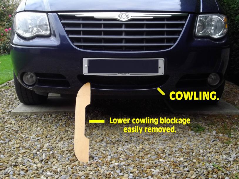 Note: By "cowling" I mean the cold air entry directly UNDER the radiator grill as seen easily from outside front. I do not mean anything to do with engine air intake. The word "cowling" is often used to mean the cover around the air intakes of jet engines. The area I mean here is the lower cold air entry from outside to the coolant radiators etc. Hope this makes it clear.