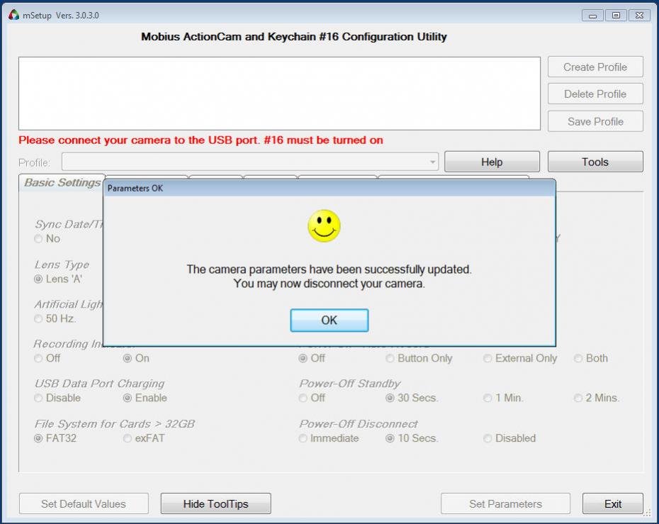 When you have duplicated my settings, click on the Set Parameters button to upload the new settings to your camera. You should then get confirmation of the upload with a screen like this: