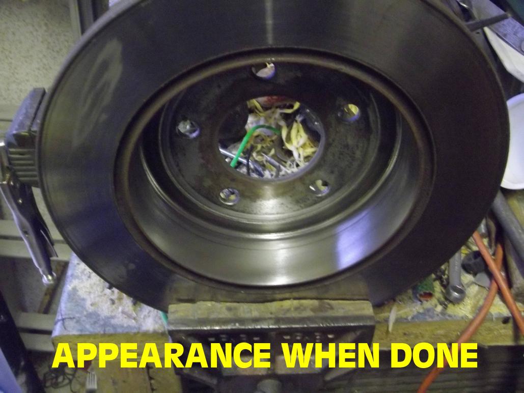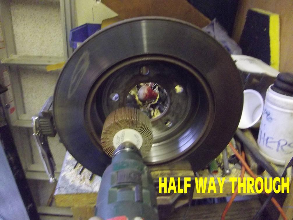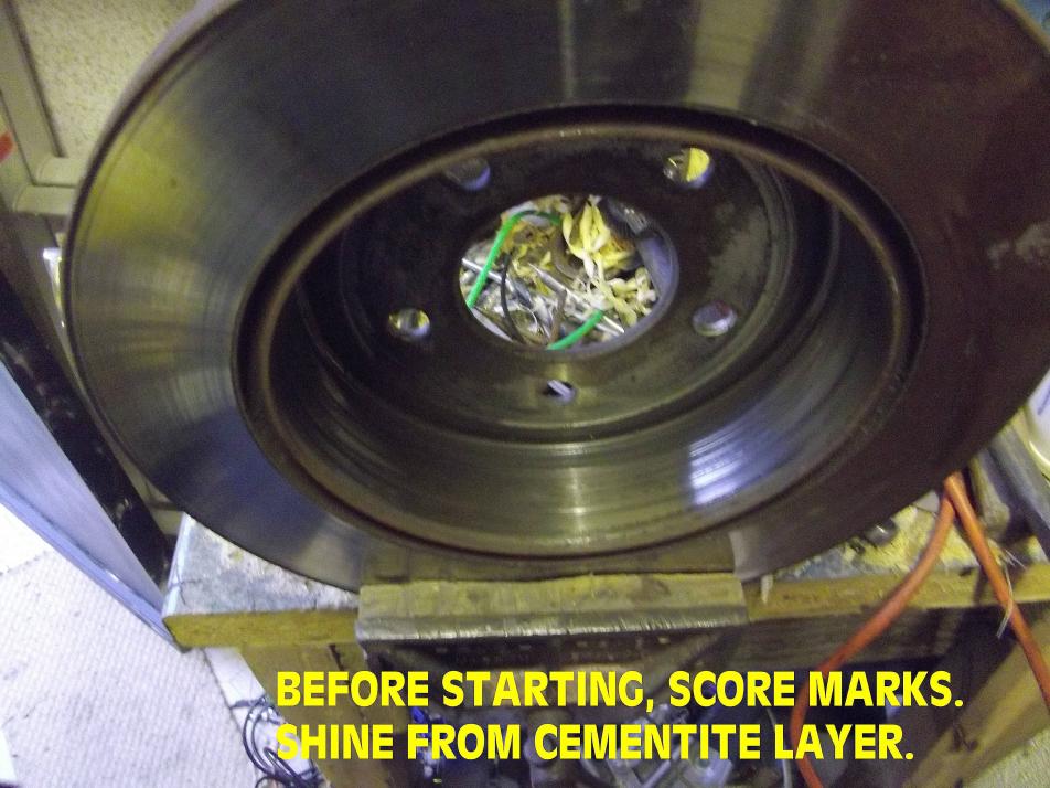 So it was off with the disc/drum, into the vice with it, and some action with a drum sander on the drum face. The idea being to grind-off any cementite or pearlite coating the surface, not to simply 'rough-up' the drum-face. Cast iron is not at all free from carbon-alloying, so it will change nature under heat and pressure, exactly what you get from brakes. It took about half an hour to bottom the scoring with the drum sander. That iron is incredibly hard. At least the bottoming was a good guide to maintaining concentricity (try saying that when you've had a few). The drum sander on the electric drill was worn down two thirds from new after de-scoring, indicating this is not a job you can do by hand. The drum sander was the garnet "flapper" type. Maybe you could use an abrasive wheel on the drill if you have one to hand.