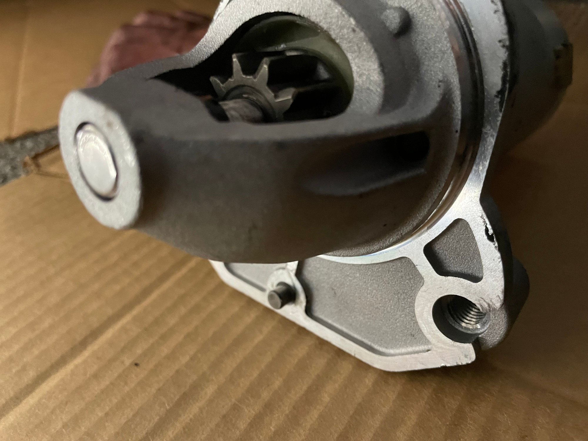 The pin between those bolt holes should have come out with the starter Here is my new starter with pin