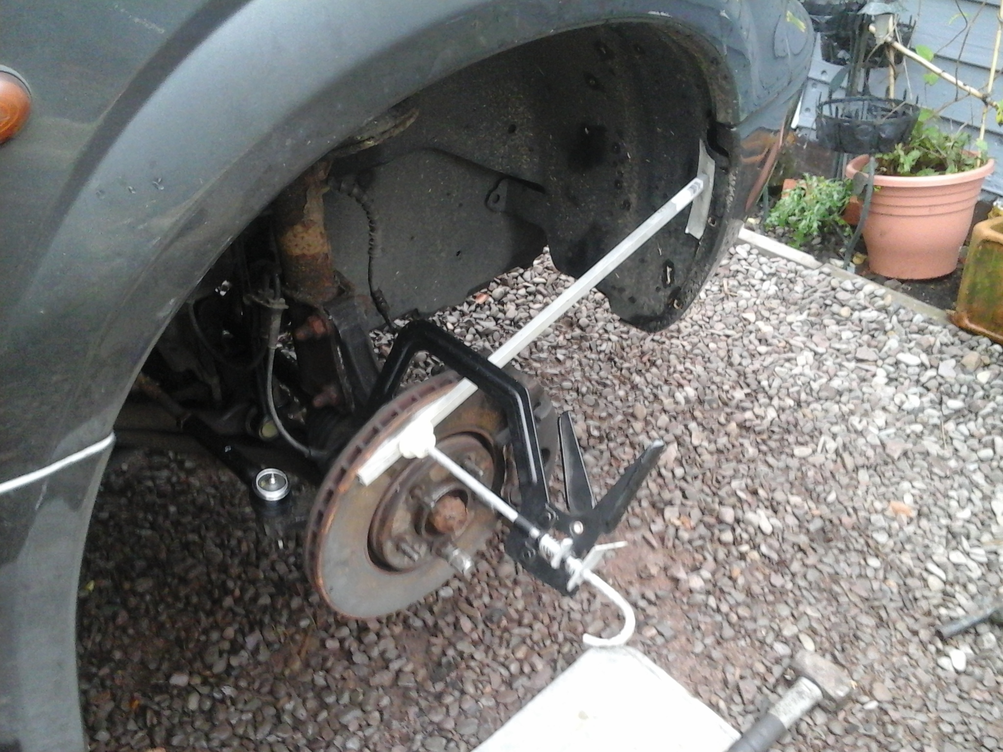 Try and make it simple as my Broadband goes. See track 1 & 2 these aid in keeping your tracking right or how it was. But lock disc to hub with nut so it does not wobble. I used Aluminium u bar with masking tape inside wheel well. Loosen ball joints with separator or one or two hammers.