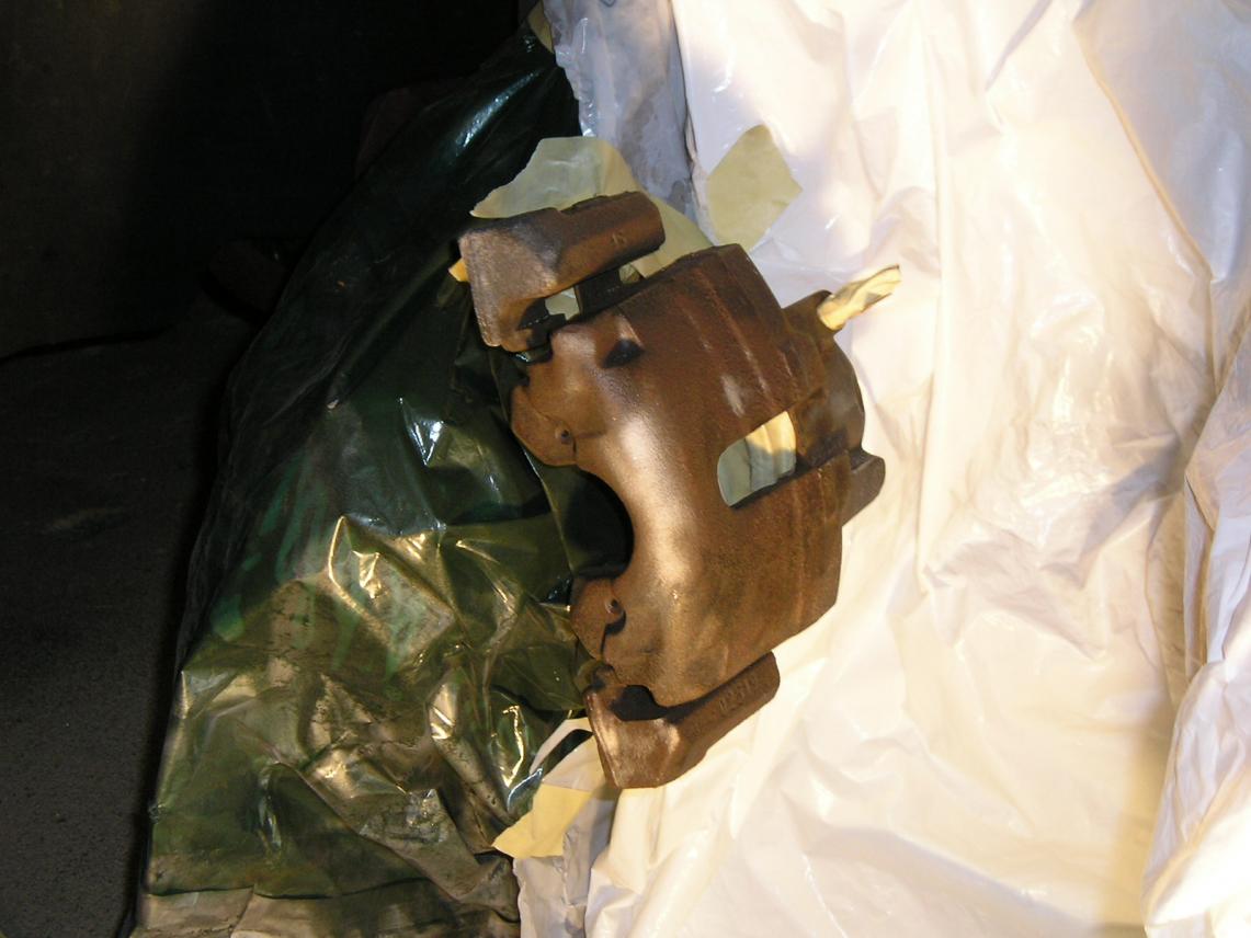 After washing them down with brake cleaner, and masking off areas not to be painted, and covering the wheel hubs against the sand, I attacked the rusty old calipers and brackets first with a wire brush cup on my drill motor, then with sandblasting. Sandblasting is a gawd-awful messy job. One more wash with brake cleaner and then spray-painted the aluminum (Rust-Oleum high temperature aluminum.) 3 coats.