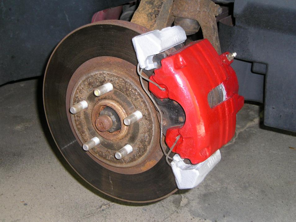 Then with a brush, I applied 3 coats of red to the calipers. The top coat was 3 coats of clear gloss caliper paint (spray by VHT). Then I put it back together, trying not to scratch the new paint too much.